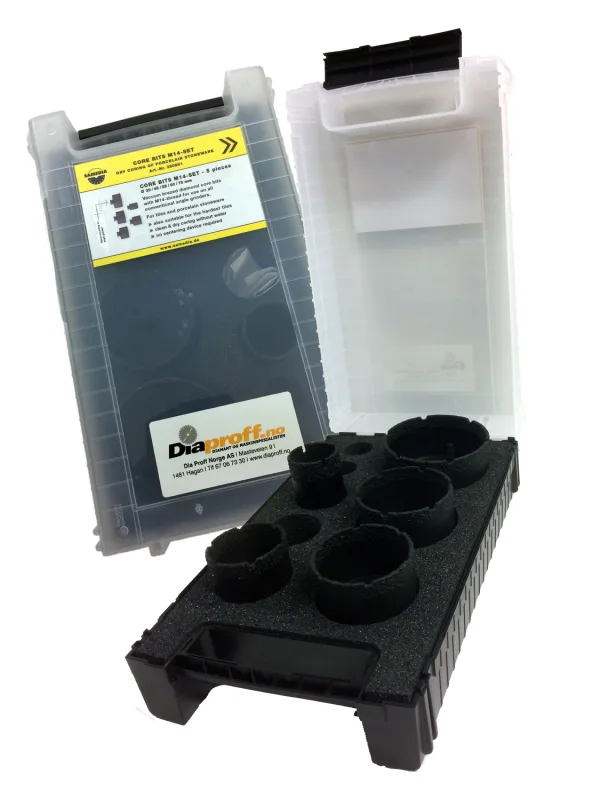 Diamant flisbor sett for vinkelsliper (max 11 000 o/min) med M14 innfesting. Borer lett i alle fliser, også de mest hardbrente som porselen fliser. Ved korrekt bruk kan et bor bore mer enn 30 hull i de små dimensjonene (6-10mm) og mer enn 100 hull i større dimensjoner. Hurtig skjærende og grove diamanter.