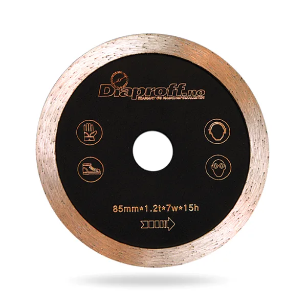 Et hel bane diamant blad med høykvalitets diamanter og kopper binding for de hardeste materialer. Dette bladet er levert i en årrekke til norske flis og murmestere. Tynt blad, men retnings stabilt og suverene skjære egenskaper. Med hel bane blad kan du unngå avflassing av glasur på fliser etc. Robust, pene snitt og lang livstid.