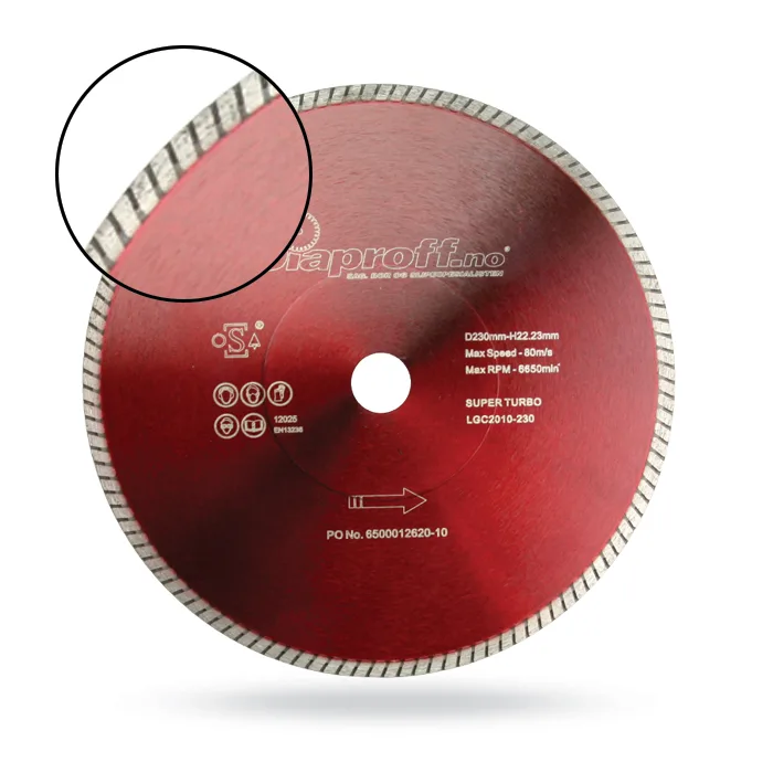 Et svært tynt diamant blad med forsterket sentrum for riktig stivhet og stor diamant konsentrasjon for raske og problemfrie kutt. Turbo spor i diamant ringen sørger for hurtig fjerning av skjære støv i kuttet. Super raske kutt i de hardeste materialer med dette verktøyet.