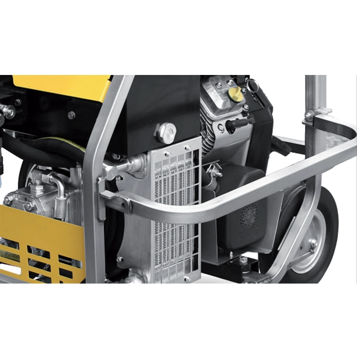 Maskinen er bygget for tøffe arbeidsforhold og er beskyttet av en solid ramme i rustfritt stål. Store, sammenleggbare håndtak gjør aggregatet enkelt å transportere og manøvrer på arbeidsplassen. Alle hovedkomponenter er montert på antivibrasjonsfester, noe som reduserer slitasje og bidrar til stabil drift over tid.