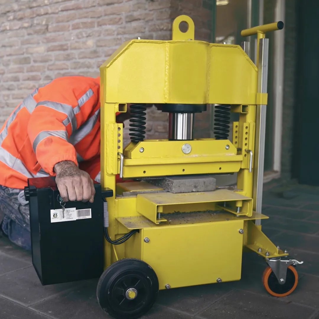 Elektrisk og miljøvennlig stein og platekutter. Utstyrt med laster og måler i støtteplaten for sikker og riktig kutting. Spesialdesignet kviner kutter med 20 tonns kraft likt og gjevt over hele flaten. Hjulsett for enkel transportering.