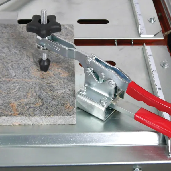 Profesjonell flissag fra Gölz for kapping av naturstein, flis, skifer o.l. Flissagen er kompakt, vannkjølt og kommer med avtakbart vannkar og støttebord for enkel rengjøring. TS250A kutter opptil 65 mm i dybden og 1200 mm i lengden. Bladhodet kan tiltes til en 45° vinklet for rask og enkel skråskjæring