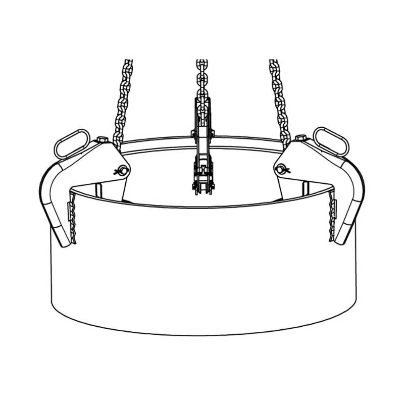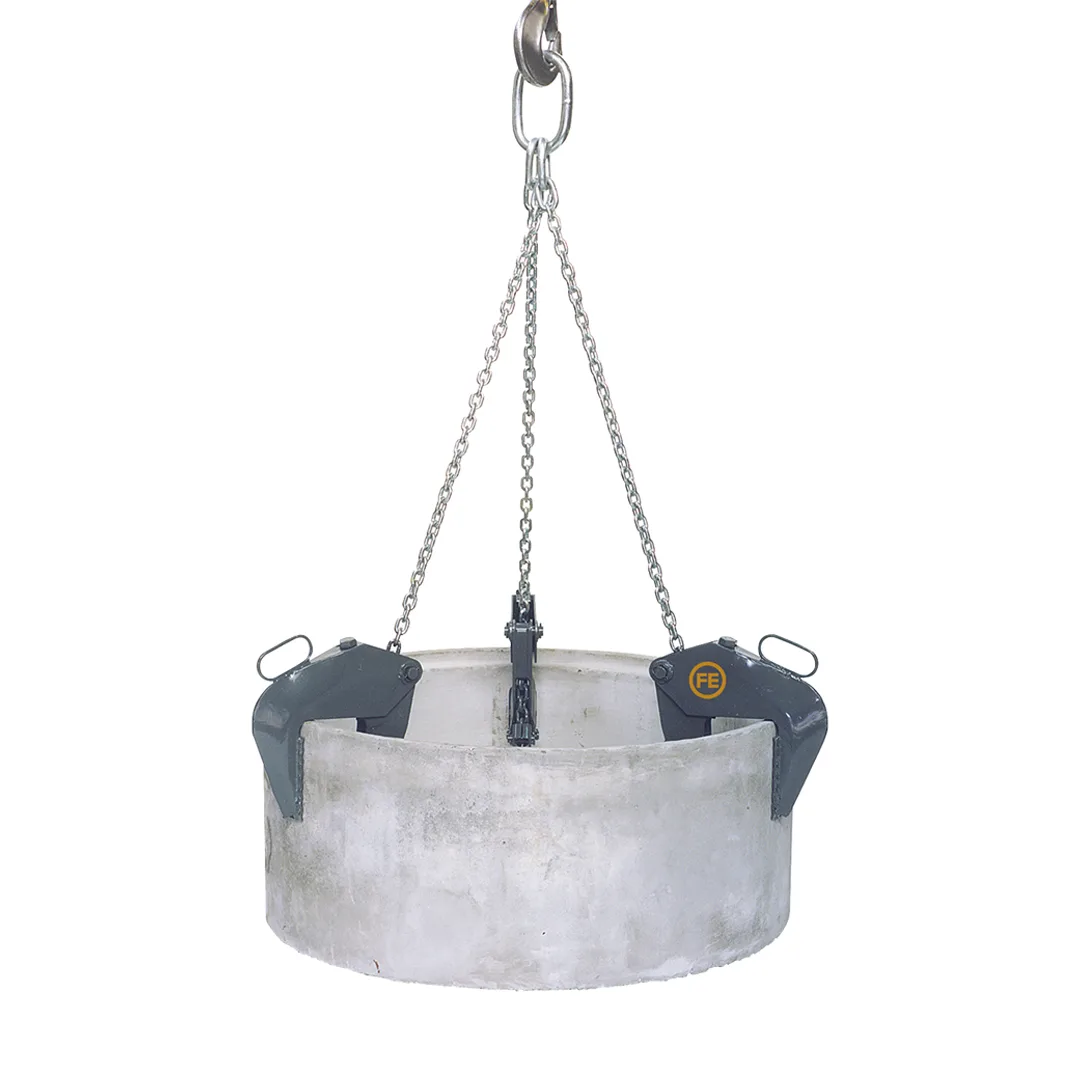 Robust stålkonstruksjon for transport og plassering av kumringer. Løfteklypen er i samsvar med offisielle sikkerhetsforskrifter og er utstyrt med et sikkerhetslås. Uventet glidning av lasten hindres av en fjær på hver klemme.
