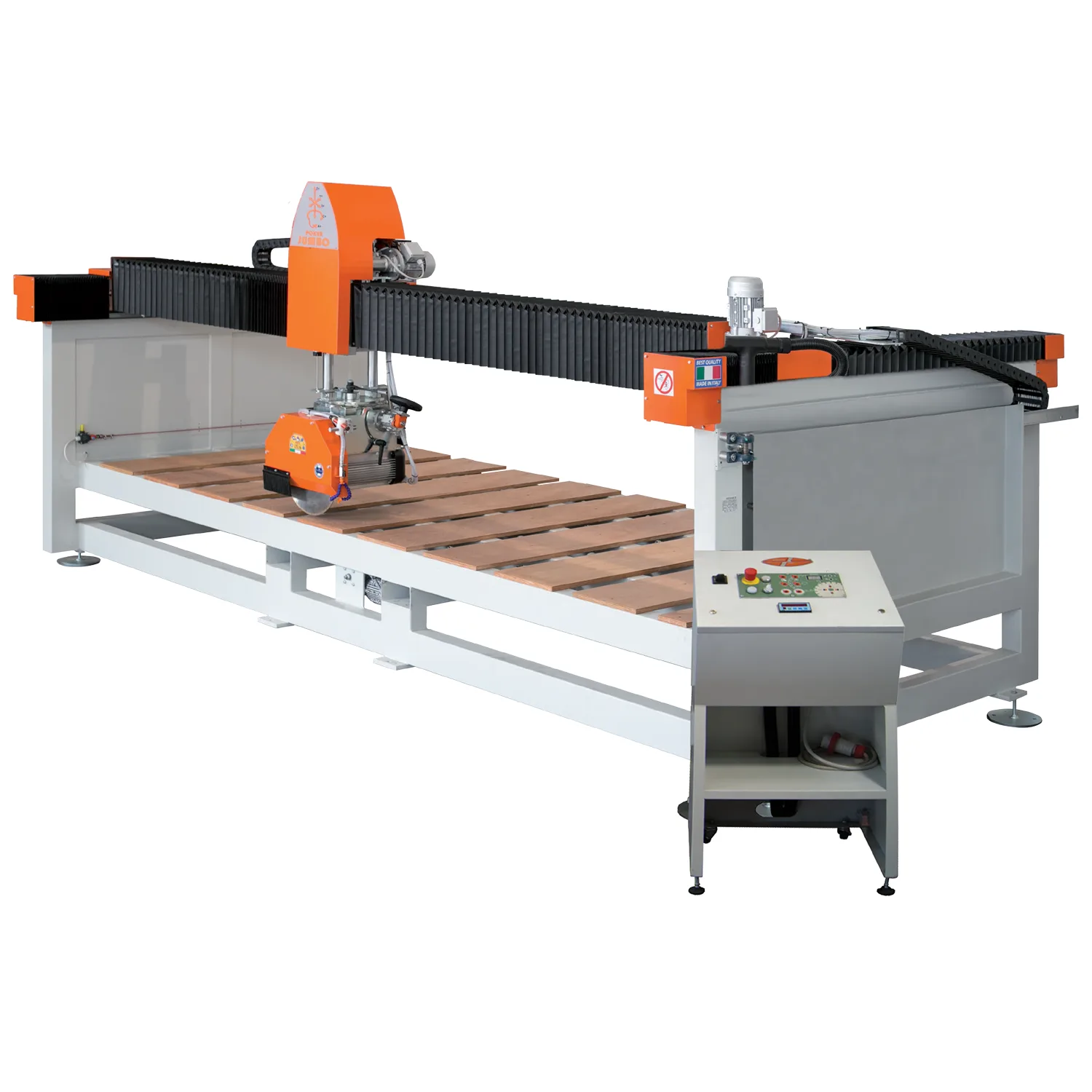 Robust og allsidig monolitisk maskin. Den kutter X-akse og Y-akse. Det travershengte skjærehodet drives av et elektronisk programkort. De viktigste tekniske funksjonene er: X Axis Traverse: 3500 mm : Y-akse: 1650 mm .; Z Akse-løft: 140 mm. Skjærehodehastighet er regulerbar. Manuell rotasjon av hodet (0-90 grader) (0-90 graders hodehllning ved hjelp av et håndhjul. Leveres med plywodd skjærebord. Kontrollpanel med trykkknapper for å drive skjærehodets bevegelser og skjerm som viser kuttehstighet. Stegvis skjæring. Regulerbar føtter. Tilbehør: Motor Hk 10 – kW 7,5, Laser montert på skjærehode for X- og Y-aksene, kar med pumpe for innsamling og sirkulasjon av kjølevann, montering av maskinen og opplæring av operatører.