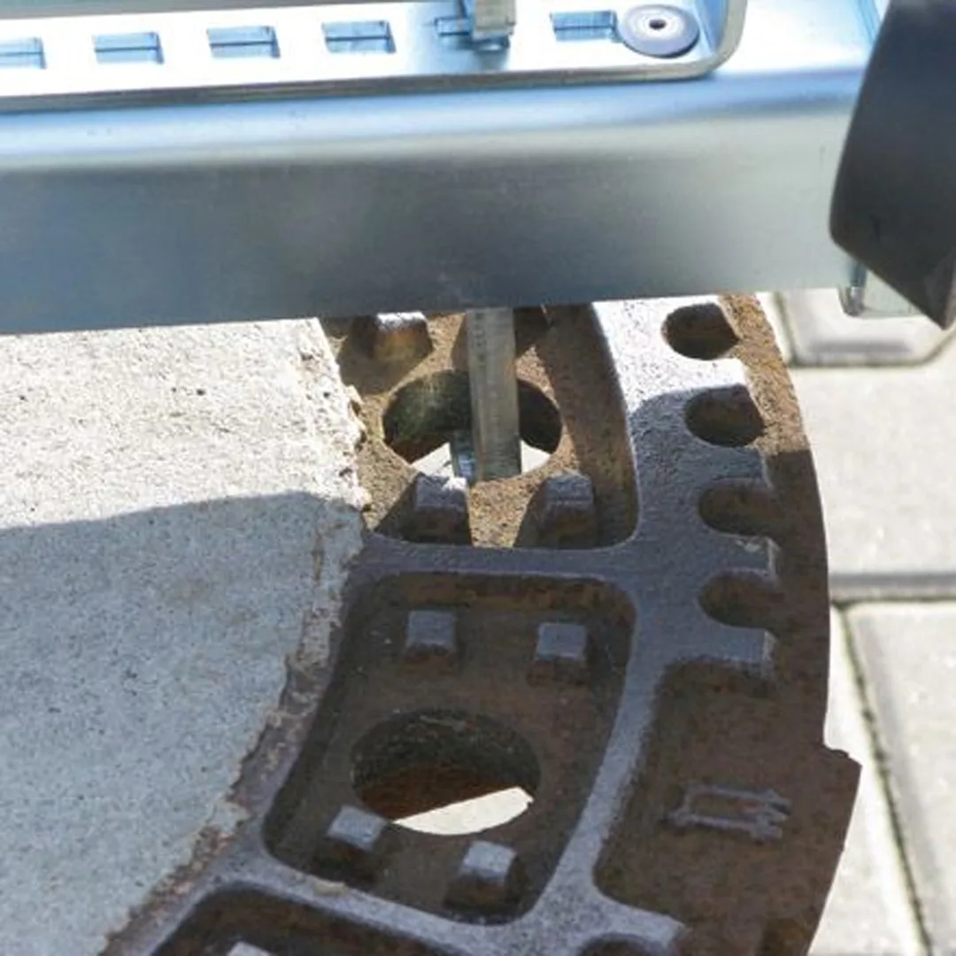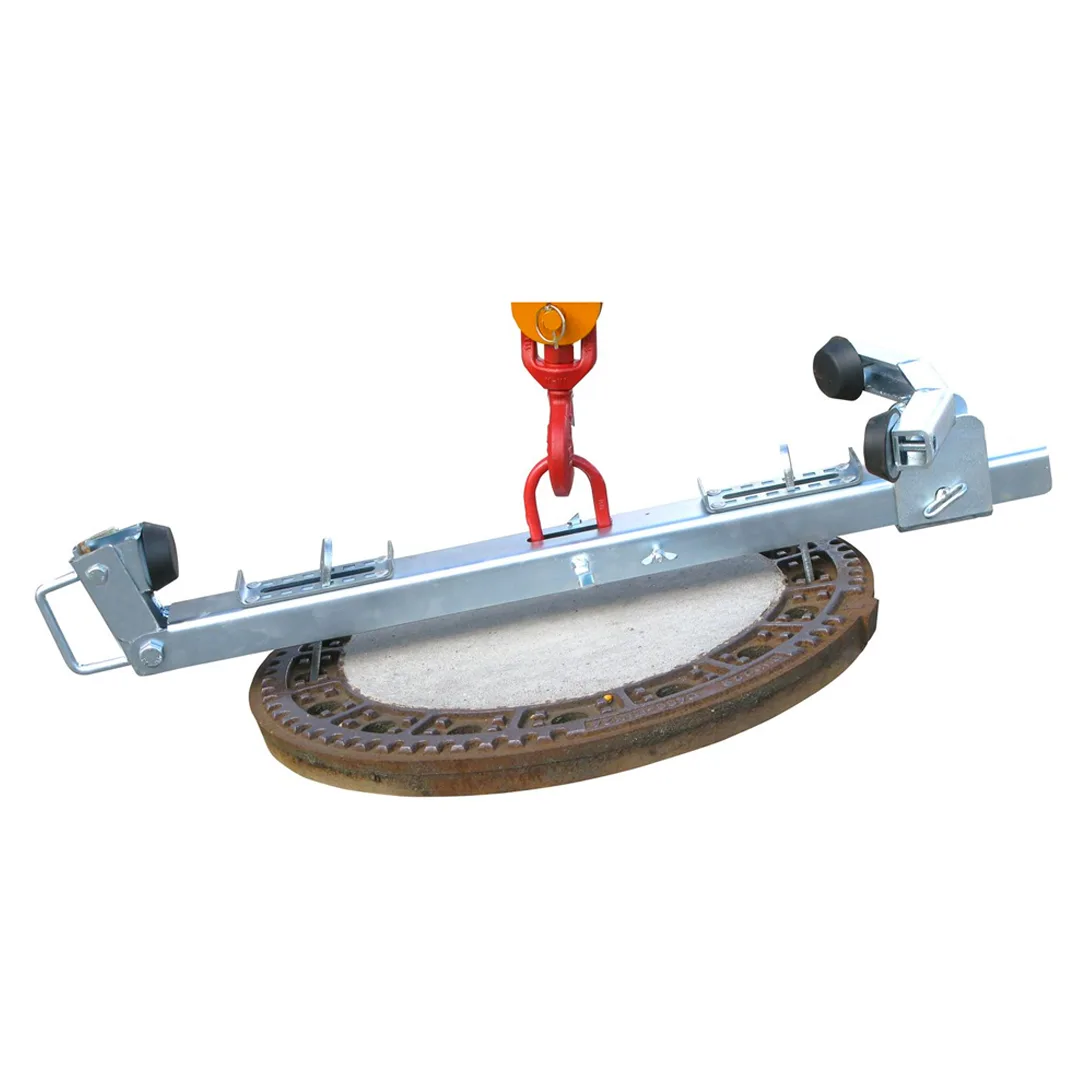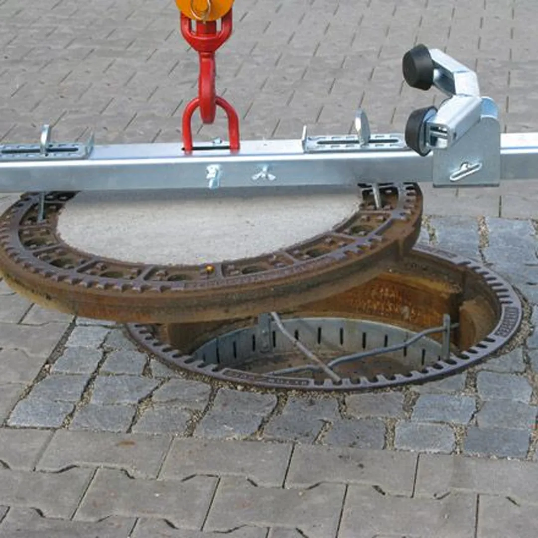 Robust stålkonstruksjon for sikker transportering og plassering av kumlokk, med både rammen og dekselet. Klypen kommer med utskiftbare gummibufferne.