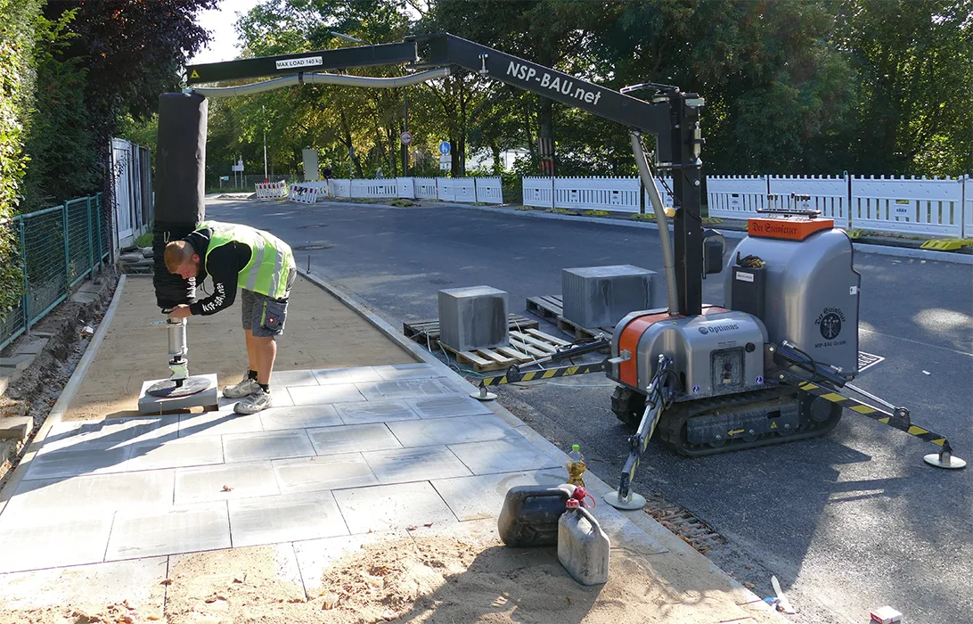Ved hjelp av den integrerte vakuumslangeteknologien flytter og legger vakuumløfter allrounder betong og natursteinselementer på opptil 140 kg.