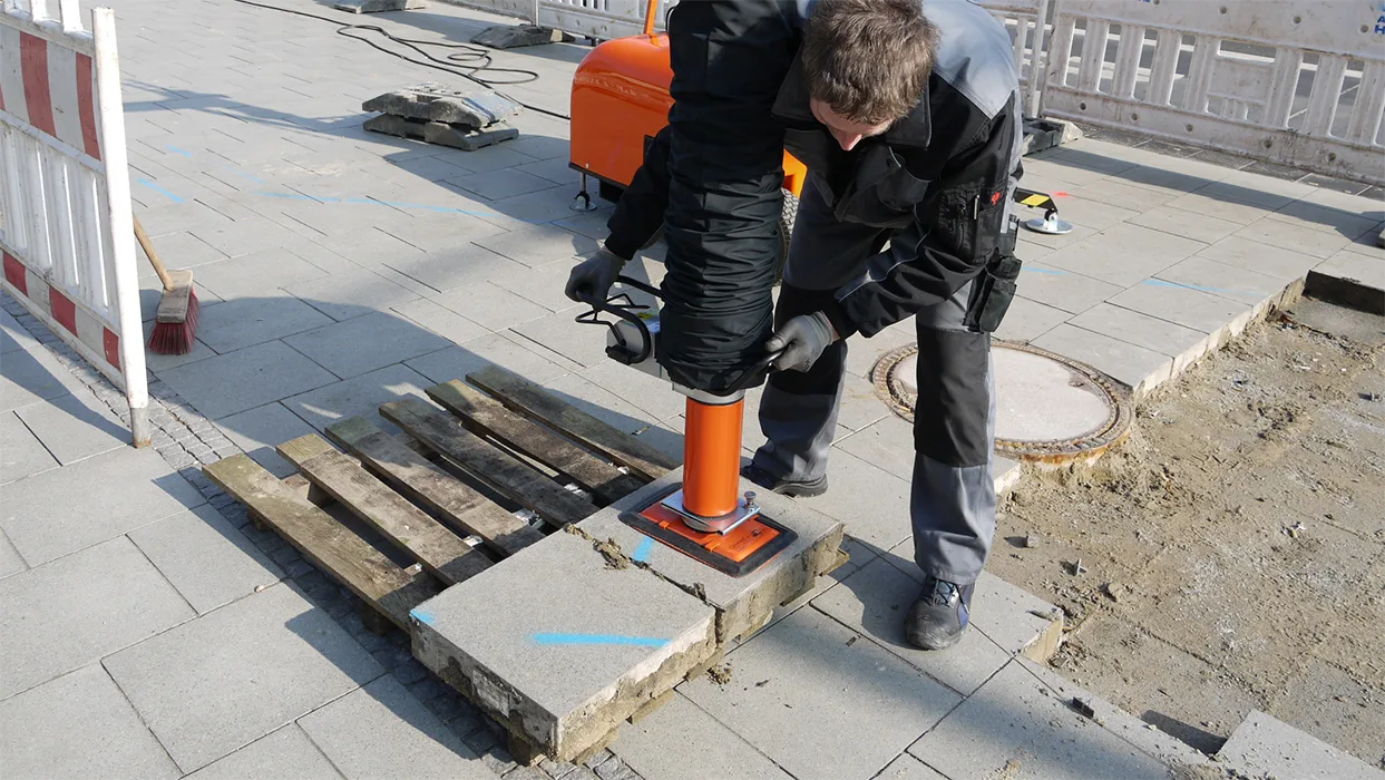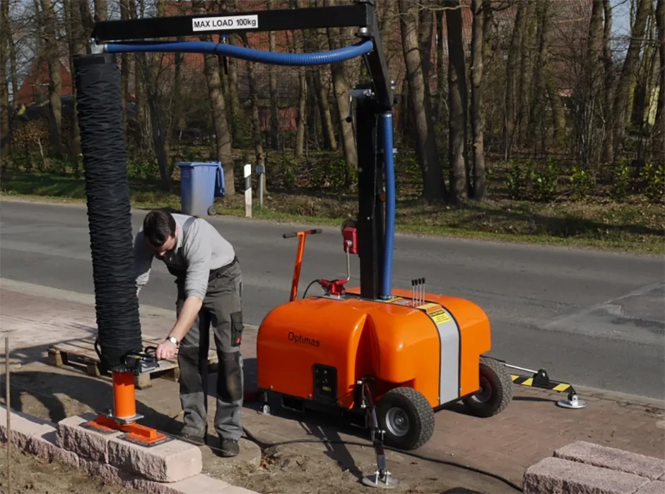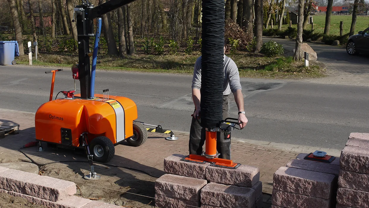 Ved hjelp av den integrerte vakuumslangeteknologien flytter og legger den elektriske vakuumløfter betong og natursteinselementer på opptil 140 kg.