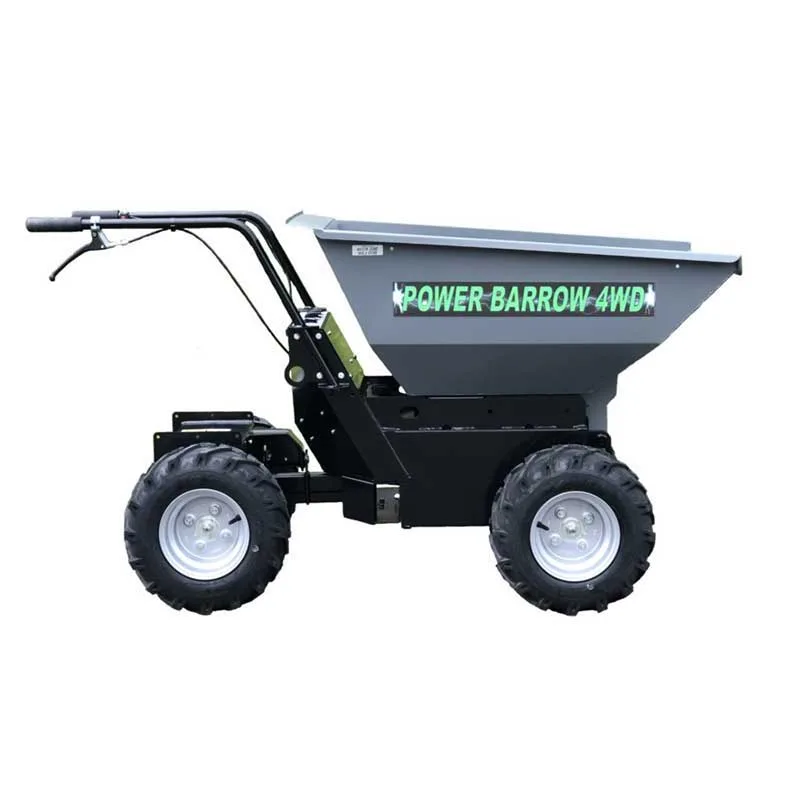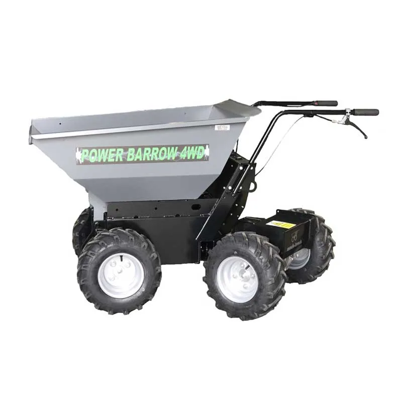 Power Barrow 4WD er utstyrt med elektrisk tippefunksjon, som gjør det svært enkelt å tømme lasten ved hjelp av en knapp. Styringen er kontrollert av den fremre enden av pivoten, noe som gjør manøvreringen enkel, og de to drevne akslene gir direkte driv til hjulene uten ledd eller kjettinger.