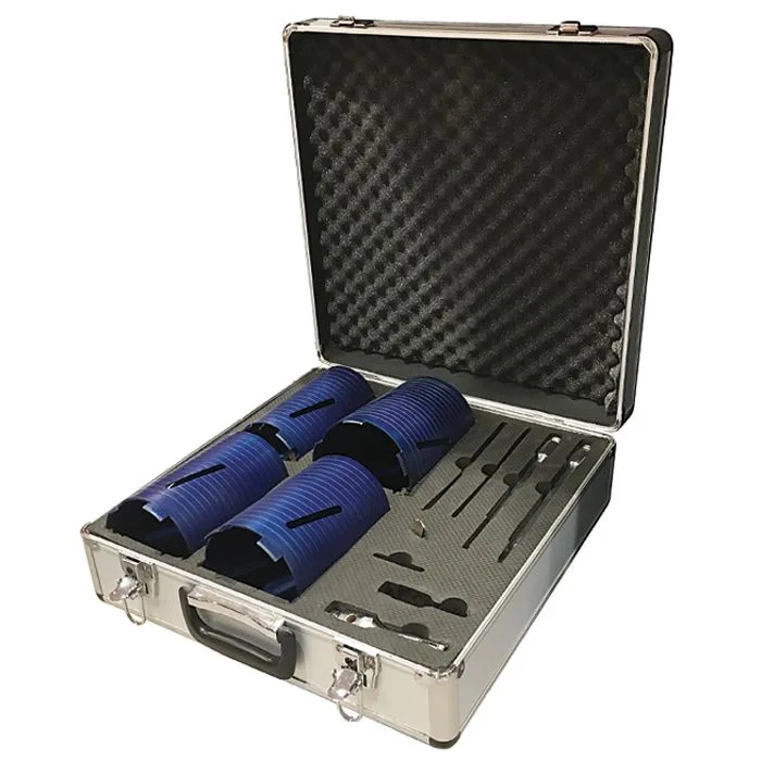 Ved installasjon av f.eks. varmepumper må det borres det hull gjennom vegger, ofte i materialer som Leca, betong eller mur. Med vårt komplette borsett får du fire stk. diamantkjernebor i Ø90 – Ø100 – Ø110 og Ø120 mm. Dette er ideelle dimensjoner for rør og kabler til. Settet leveres i en solid koffert av aluminiums med senterbor og innfestninger, slik at du har alt samlet på ett sted.