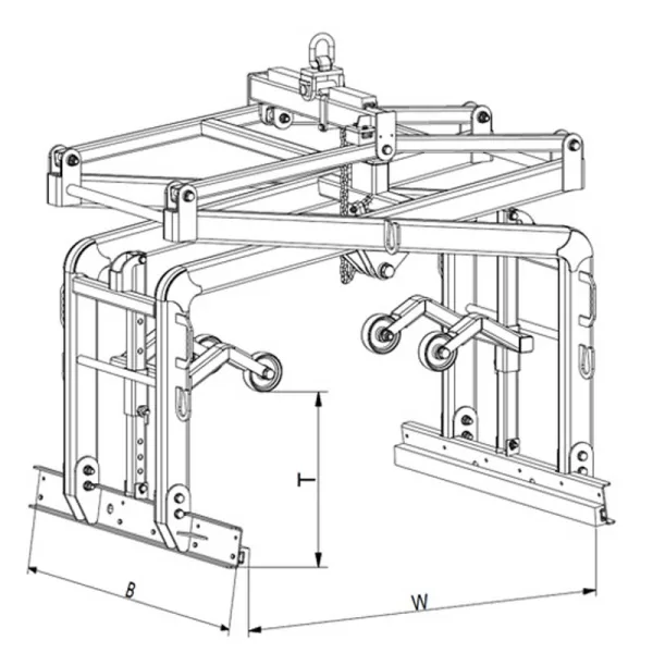 (T) = Gripedybde / (W) = Gripebredde / (B) = Kjevelengde / (L.K) = Løftekapasitet / (V) = Vekt